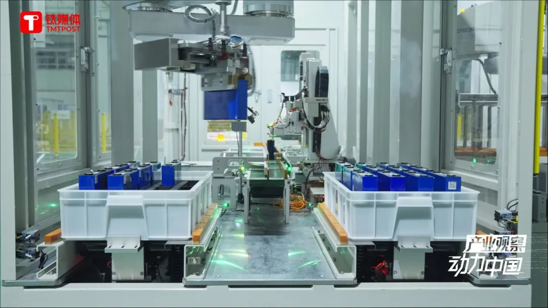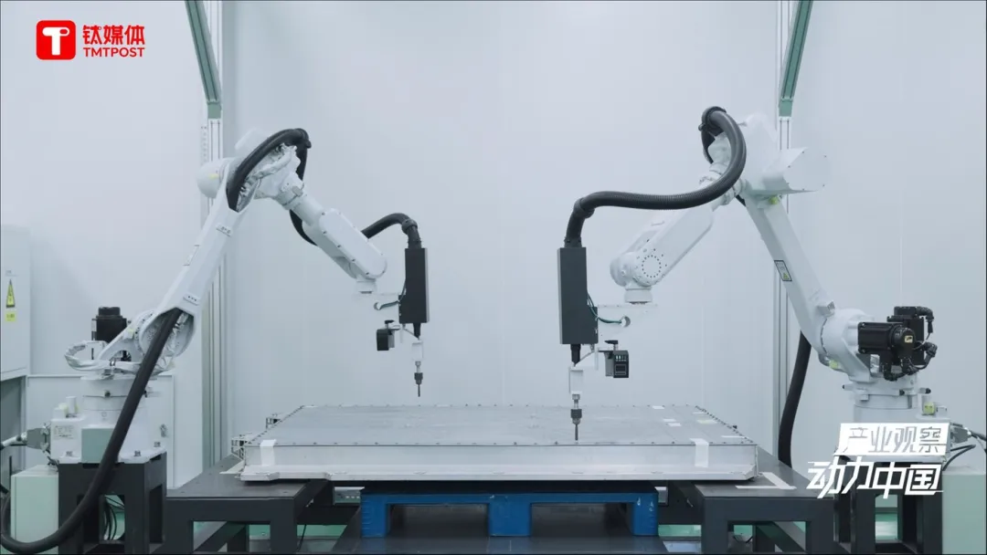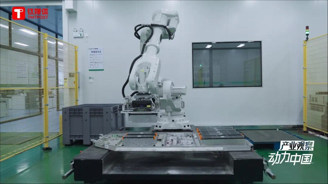 电池包的上盖拆开后,工人处理完线束,机械臂将继续介入,来完成电池包内的模组搬运。