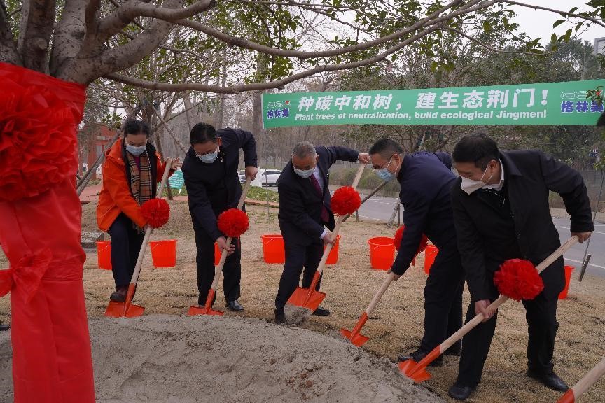 图1 格林美集团党委书记、董事长许开华教授与荆门市委书记胡亚波共植“碳中和树”